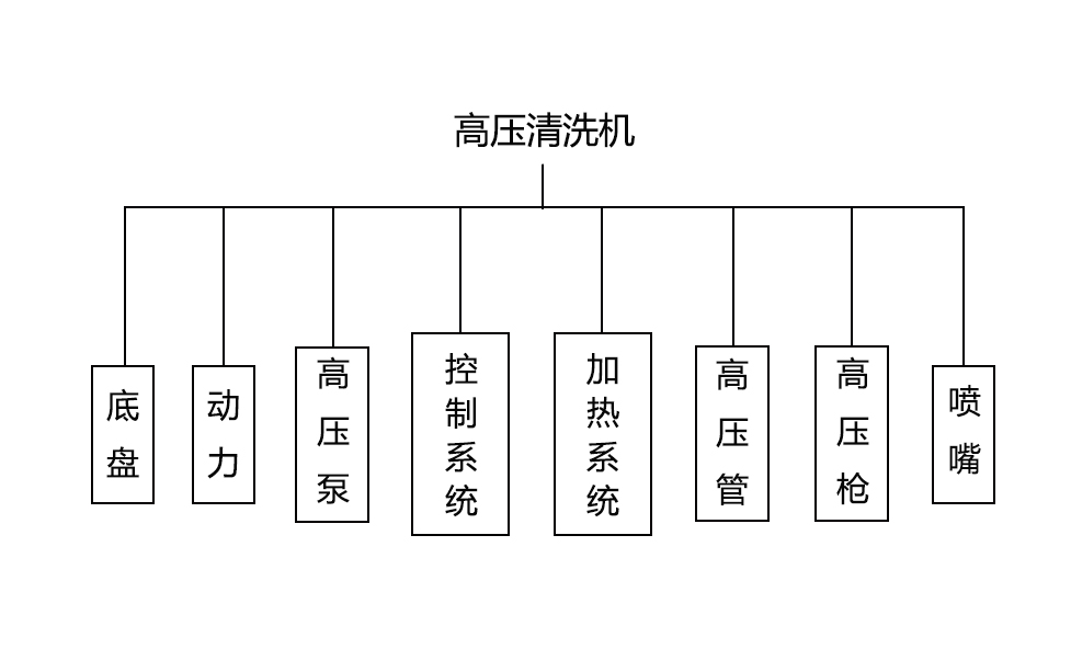 高壓清洗機(jī)組成部分:底盤-動(dòng)力-高壓泵-控制系統(tǒng)-高壓管-高壓槍-噴嘴。