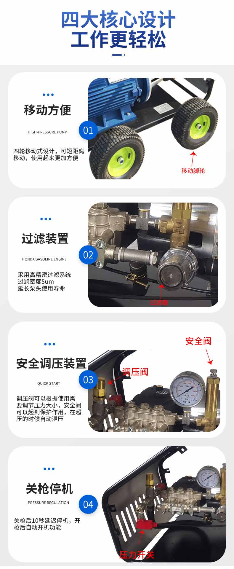 RJHT-5022型防爆高壓清洗機,采用意大利進口高壓泵,壓力調(diào)節(jié)和安全控制閥等多種安全防護裝置,具有安全性高,使用操作穩(wěn)定等優(yōu)點。
