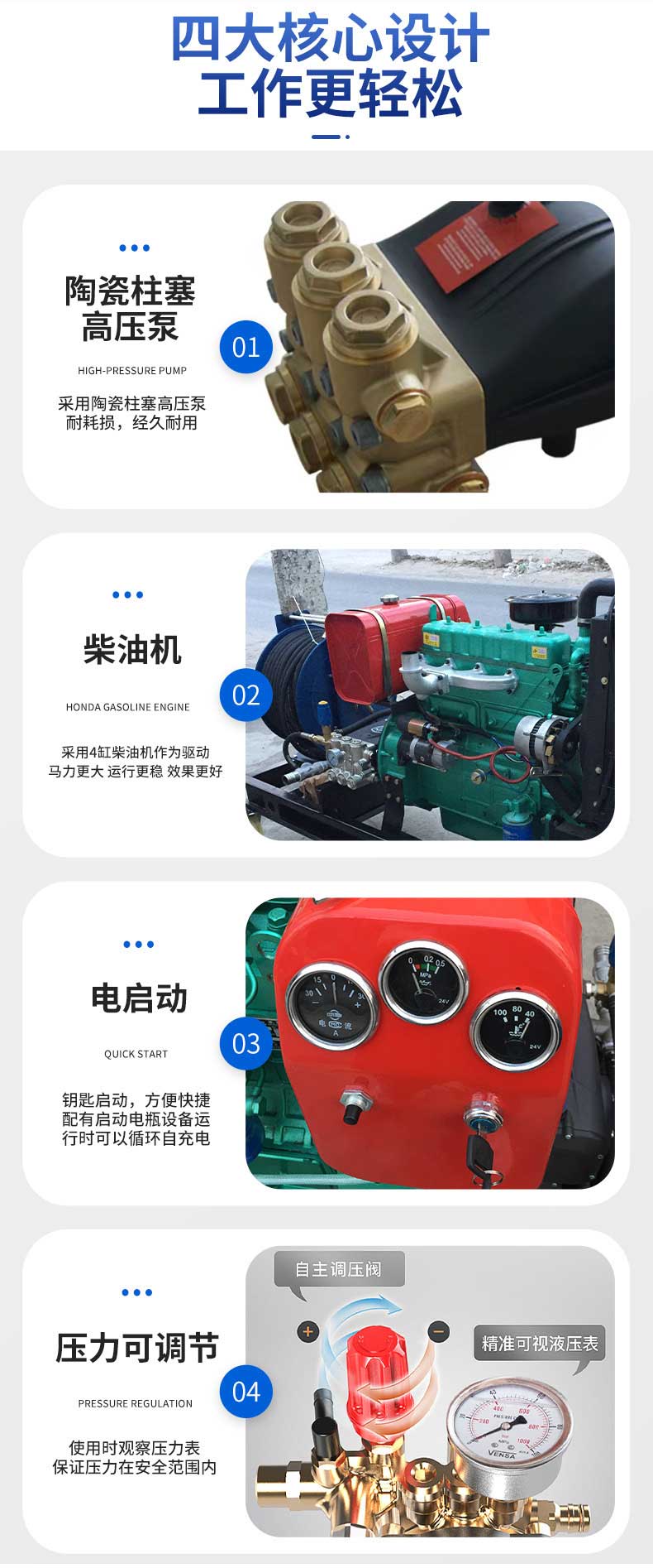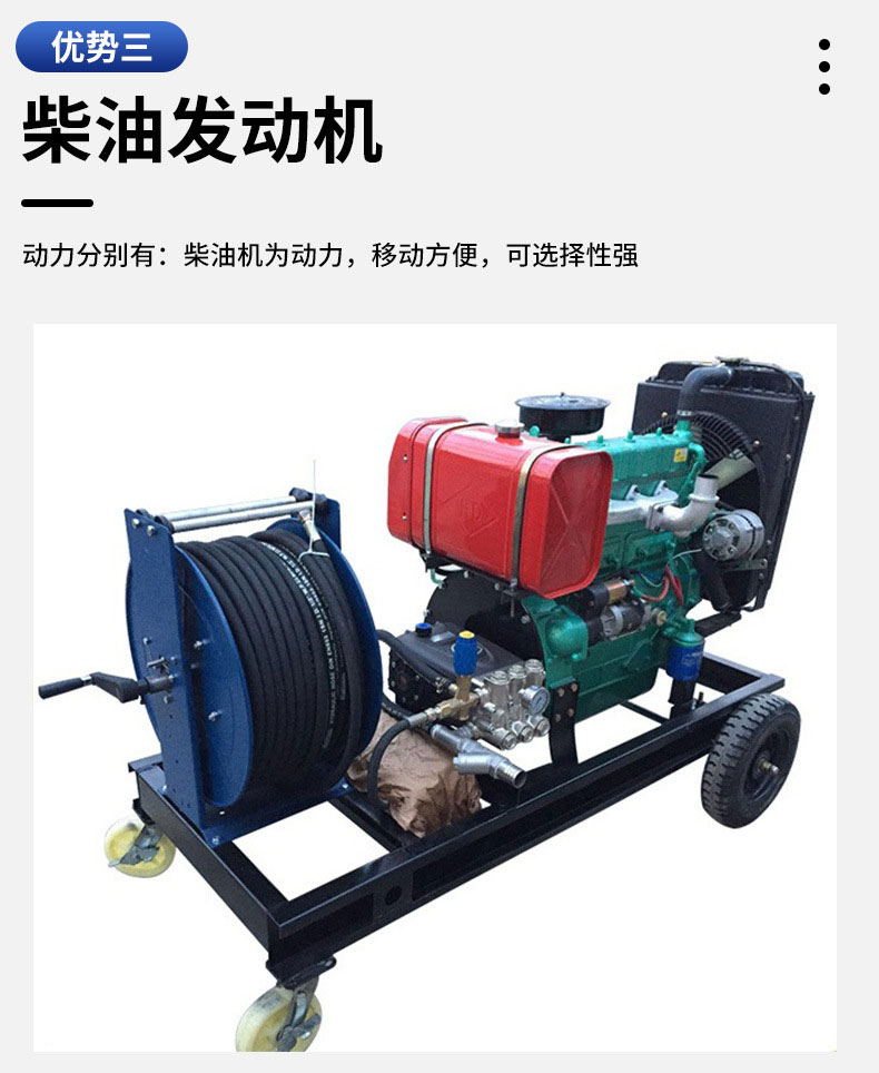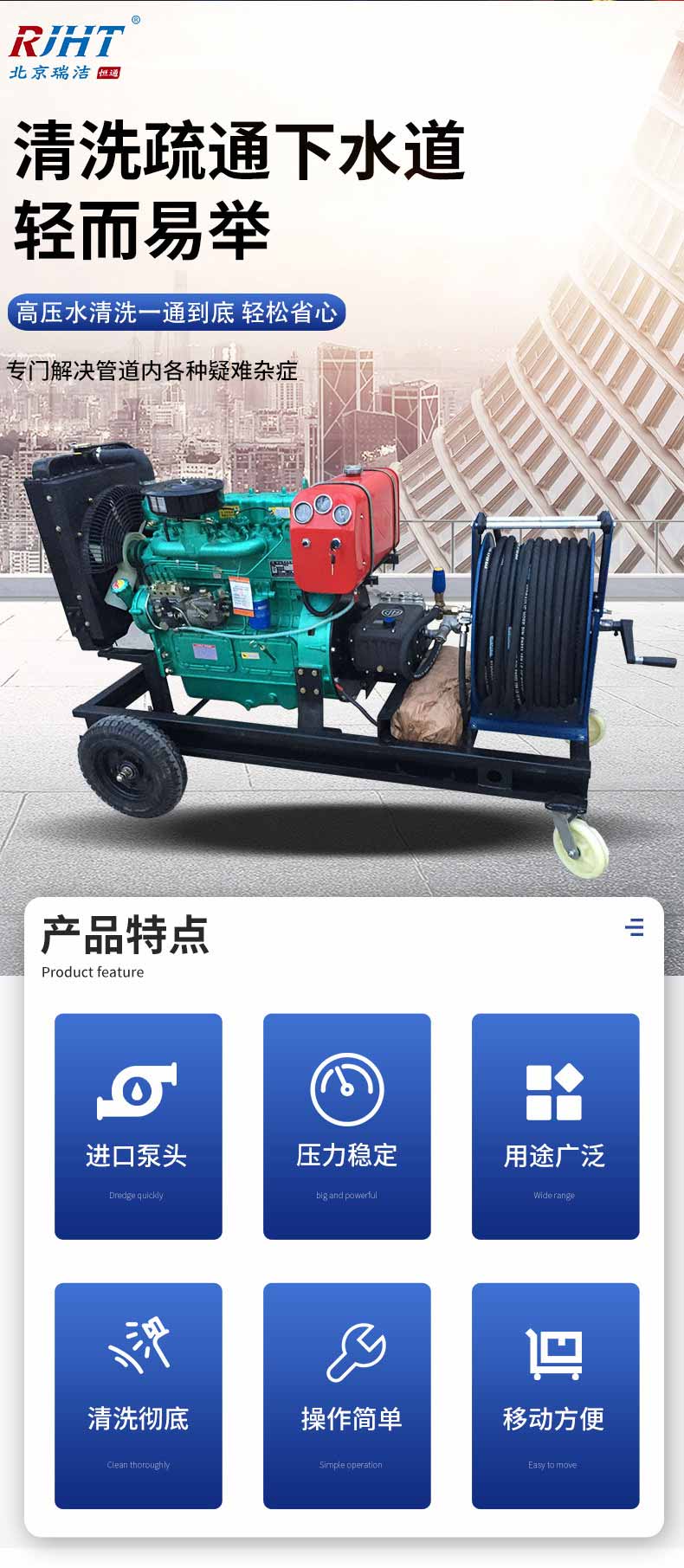 RJHT-800型 41馬力柴油機(jī)驅(qū)動的大流量高壓管道疏通清洗機(jī),采用意大利進(jìn)口高壓泵,壓力調(diào)節(jié)裝置、不銹鋼壓力表和精密過濾器等多種安全防護(hù)裝置,具有安全性高,使用操作穩(wěn)定等優(yōu)點(diǎn)。